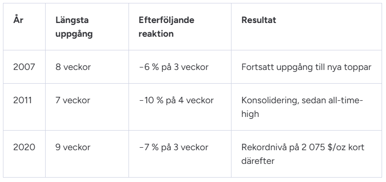 📈 Ett rally utan motstycke Sedan slutet av sommaren 2025 har guldet klättrat från cirka 3 550 $ till 4 200 $ per uns – en uppgång på drygt 12 %. Det här är bara tredje gången sedan 1970-talet som guldet lyckats stänga upp nio veckor i följd.Tidigare rekordrallyn har nästan alltid följts av kortare pauser eller milda nedgångar – men inte av långvariga krascher.